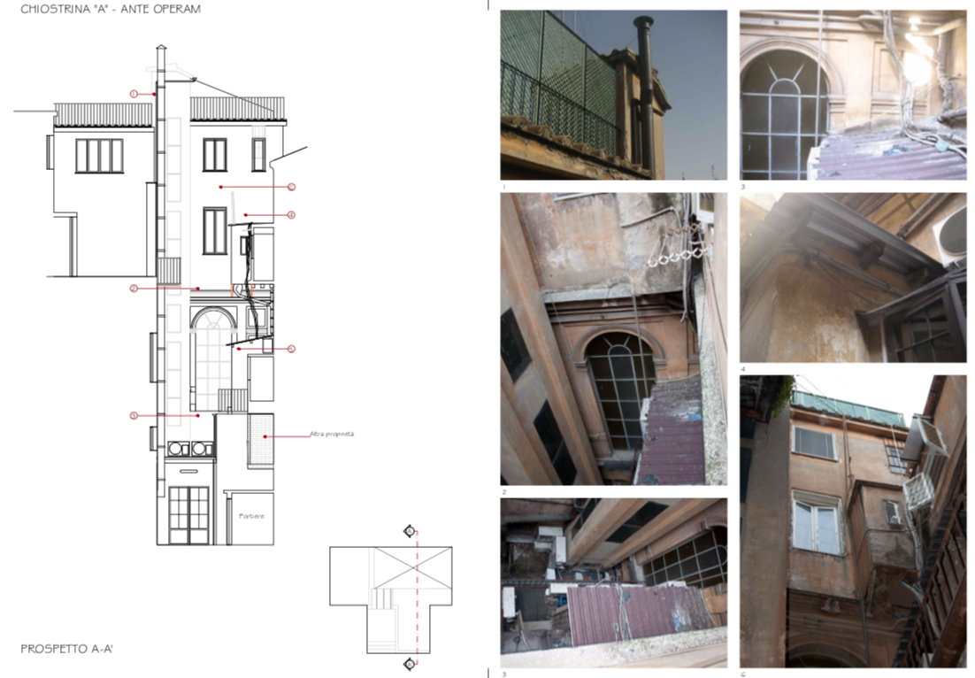 La chiostrina infatti, su cui si affacciano le zone di servizio degli appartamenti,noncheĢ le vetrate del corpo scala, aveva ormai perso la sua originaria funzione di dare “luce ed aria”agli ambienti che vi si affacciavano per una serie di elementi e superfetazioni che erano stati posti al suo interno,oltre al degrado dei prospetti e delle strutture che non erano mai stati oggetto di restauro conservativo.