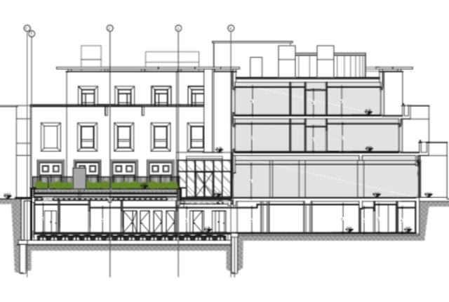 L’ampliamento del piano interrato interessa anche la piastra esterna adibita a parcheggio che saraÌ? oggetto di generale riassetto finalizzato a massimizzare posti auto e implementare il verde.