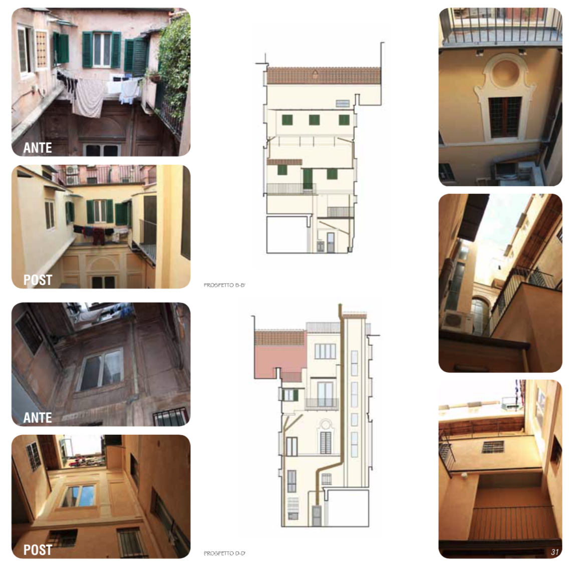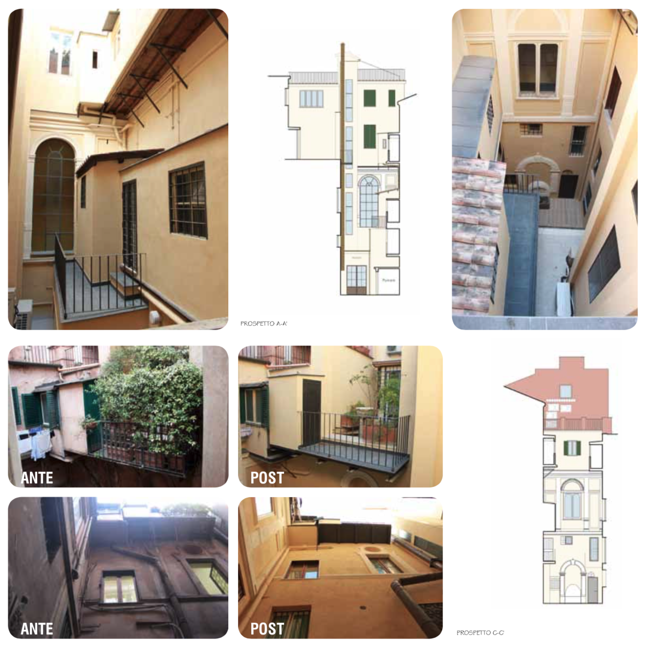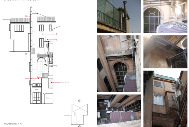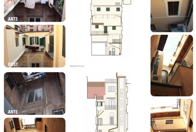 La chiostrina infatti, su cui si affacciano le zone di servizio degli appartamenti,noncheĢ le vetrate del corpo scala, aveva ormai perso la sua originaria funzione di dare “luce ed aria”agli ambienti che vi si affacciavano per una serie di elementi e superfetazioni che erano stati posti al suo interno,oltre al degrado dei prospetti e delle strutture che non erano mai stati oggetto di restauro conservativo.
