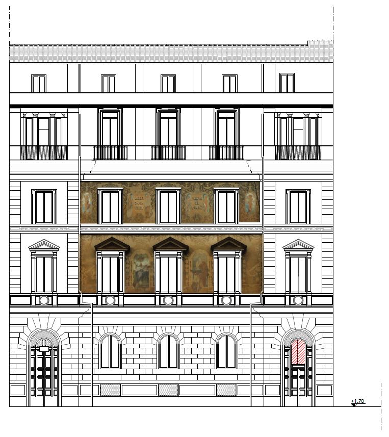 Nell'insieme delle attività la facciata principale affrescata è stata oggetto di restauro conservativo con recupero e valorizzazione dell'affresco presente.