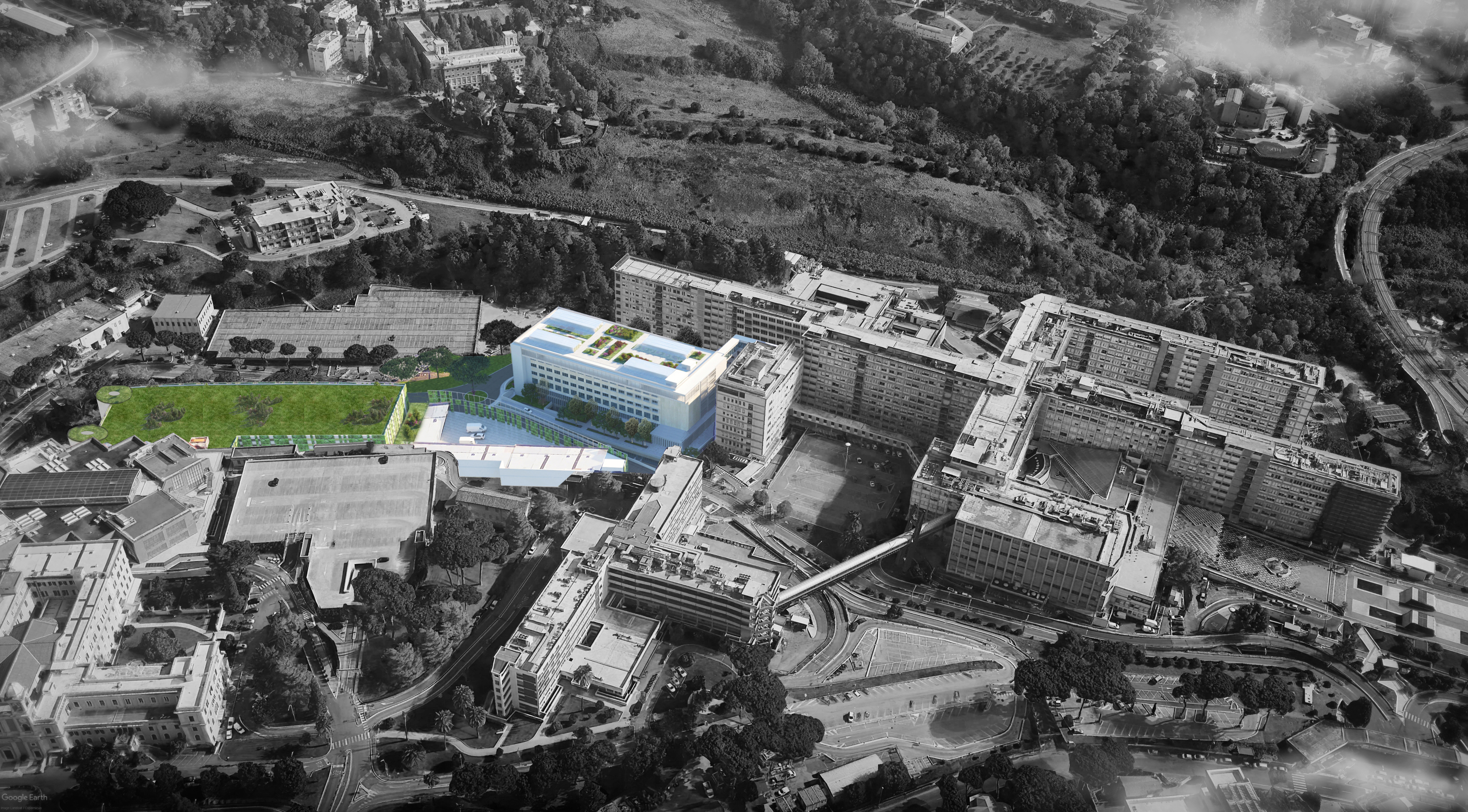 L’intervento interessa una porzione del compendio immobiliare del Policlinico Gemelli e prevede la realizzazione di un nuovo edificio di 8 piani, destinato ad ampliare l’offerta sanitaria con la realizzazione di 6 piani dedicati alle degenze, agli ambulatori e agli interventi con 8 nuove sale operatorie; due piani saranno dedicati ai laboratori diagnostici ed un piano ai dipartimenti universitari.