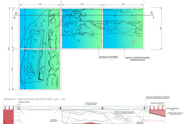 L’intervento ha riguardato la realizzazione di una teca in cristallo per consentire la visibilità e nel contempo la protezione dagli agenti atmosferici dei “reperti archeologici” rinvenuti durante le operazioni di scavo per le opere di Restauro Conservativo del Complesso Immobiliare.